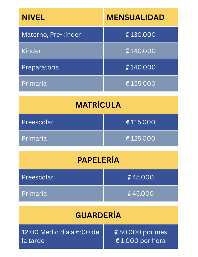 A continuación se detallan los montos para el curso lectivo 2026, así como las edades de ingreso para los diferentes niveles.
